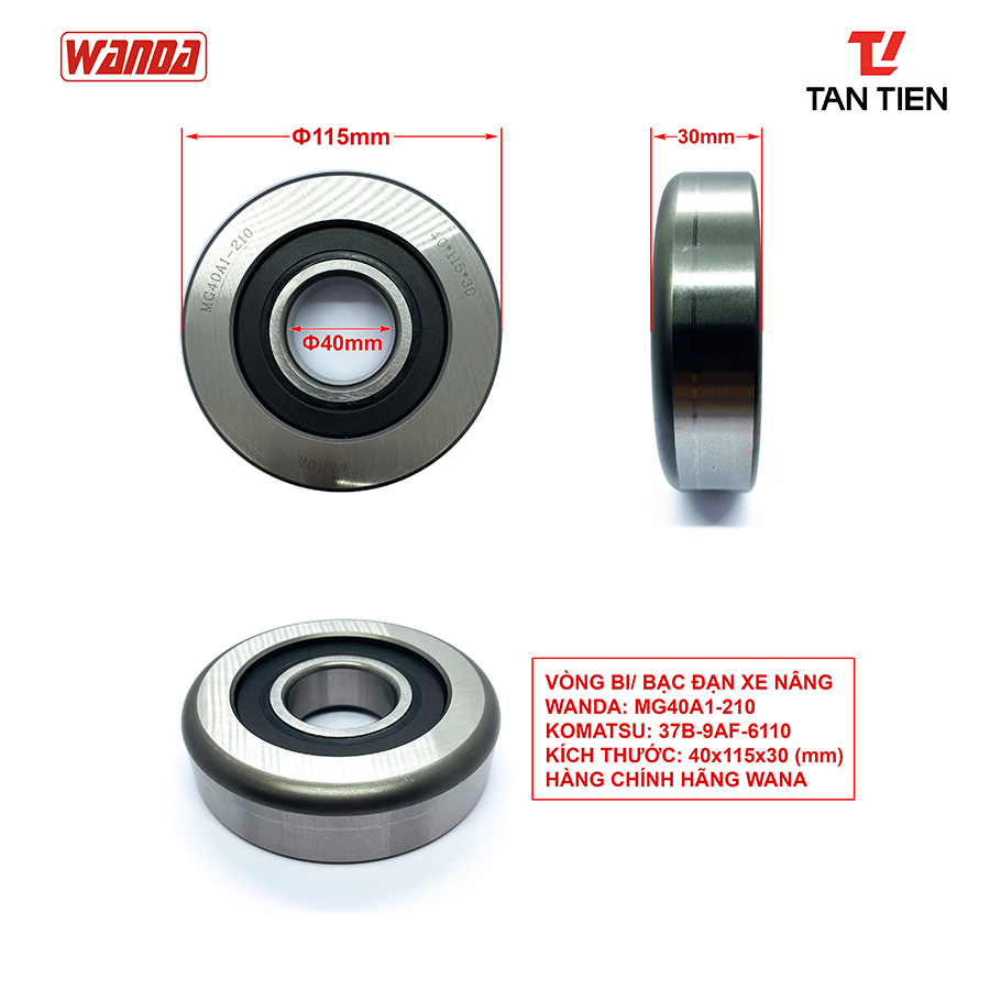 Vòng bi xe nâng 40x115x30 Wanda – MG40A1-210 là lựa chọn phù hợp và kinh tế để thay thế cho các mã 37B-9AF-6110, 37B-9AF-6120 trên xe nâng Komatsu 2 tấn, 2.5 tấn. Sản phẩm đảm bảo độ bền, khả năng chịu tải và vận hành ổn định trong thời gian dài.